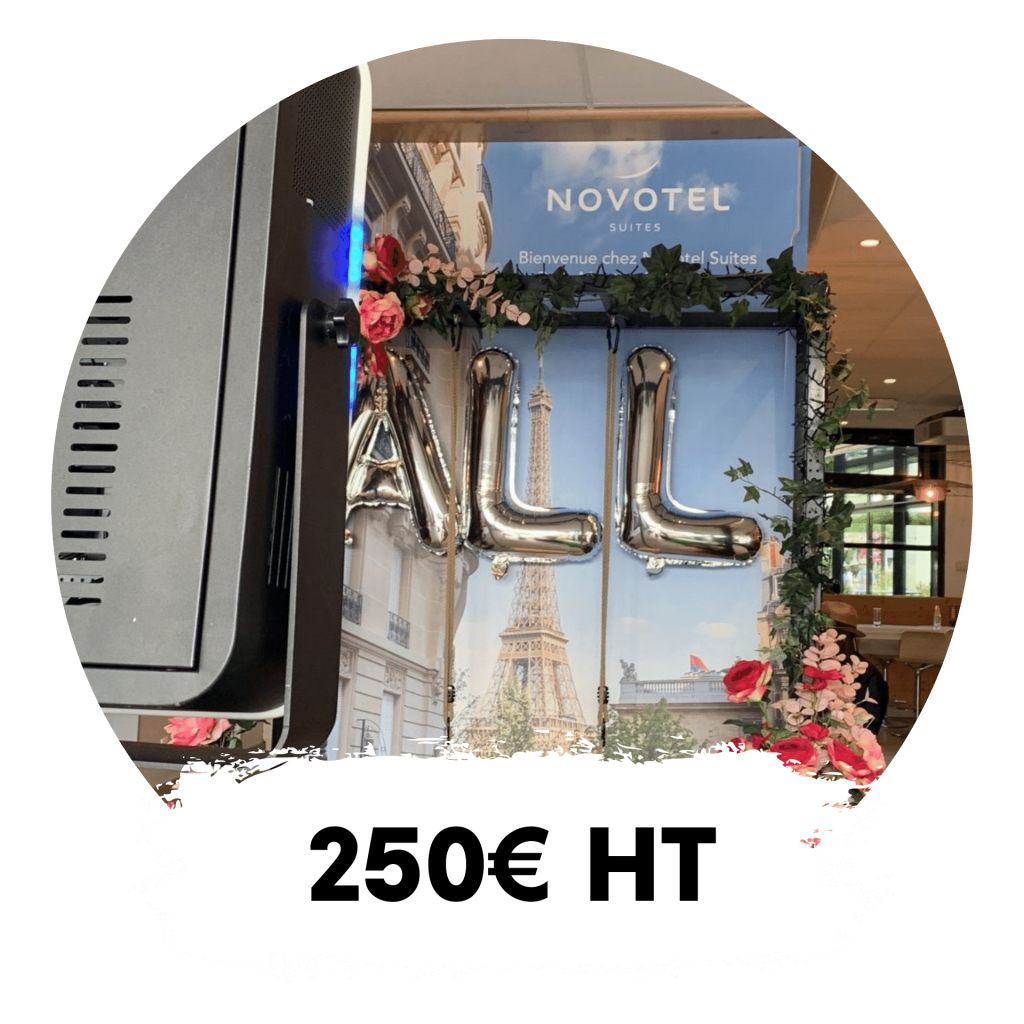 Livraison du photobooth et animation pendant 4h, photos illimitées en 8 secondes, personnalisation de la borne.